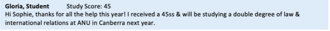 Every tutor you come across in this industry is likely a high scorer, including mine, but that alone is no guarantee of a good tutoring experience. What we offer is different in that my students-turned-tutors are not only fully versed in my very specific and methodical approach to English but by first being one of “Soph’s Students” themselves, they have been vigorously screened and mentored to have the specific skill sets to teach effectively and not just score highly themselves. This is tried and tested with my first tutor Clare, who scored a 50 in 2022, had her first year 12 student in 2023 score a 49, showcasing just how effective this cycle is!
